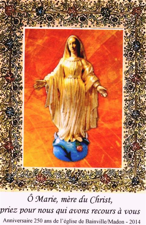 Pour les 250 ans de la construction de l'église de Bainville sur Madon (54) , le président de l'association : le livre l'histoire et l'obusier a restauré une statue de la Vierge en fort mauvais état. Après de nombreuses heures de travail, elle a retrouvé tout sa beauté d'origine et sa place à l'église de Bainville.